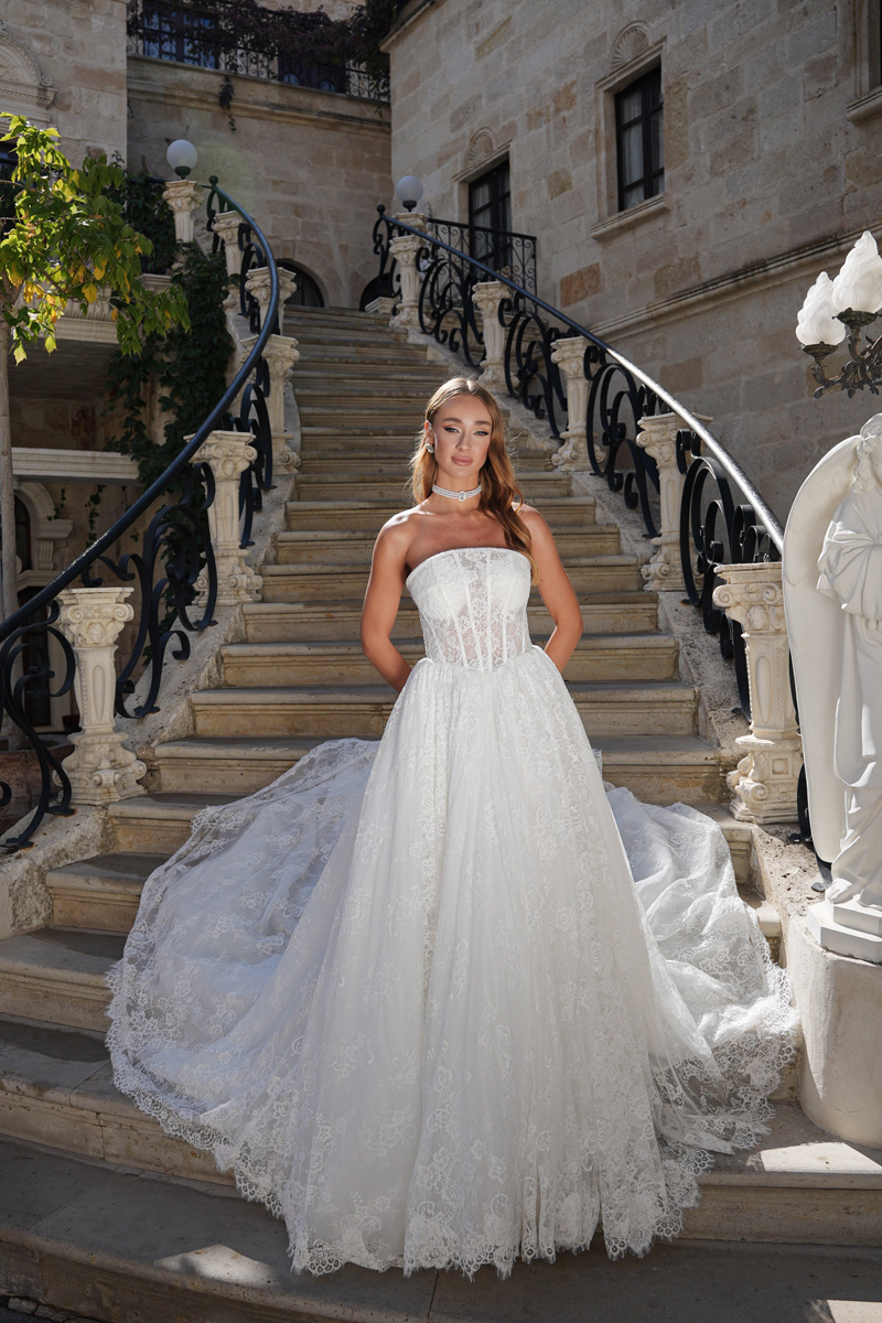 Our wedding dresses blend timeless silhouettes with bold, fashion-forward details, reflecting the latest trends while preserving the essence of classic bridal beauty. From sculptural corsetry and fluid draping to delicate lacework and luminous fabrics, each design tells a story of sophistication and individuality.